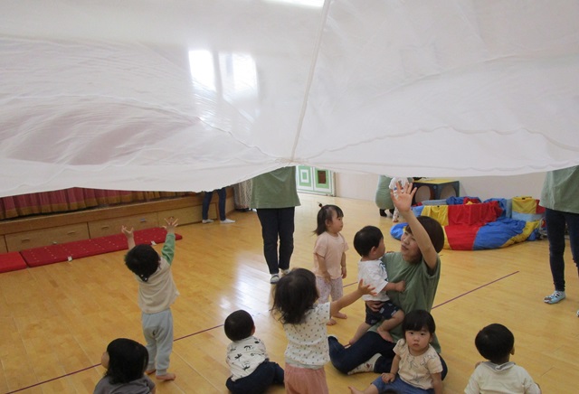 最後はオーガンジーのパラシュートをしました。ふわふわ上下するパラシュートに手を伸ばしたり上をじーと眺めたりと、とても嬉しそうな子ども達でした!!