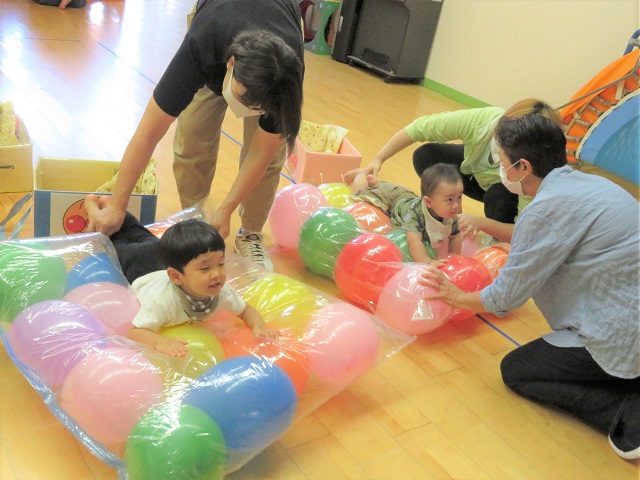 2022/10/30あいあいKid's 10月のあいあいkids(ピクニックに行こう!) 10月のあいあいkidsはピクニックに行こう!をテーマに行いました。フリームーブメントでは、ポットン落とし等の手先遊びなどをしました。 ピクニックに行こうでは、キャスターの車に乗り出発した後、風船のマットに乗ったり、果物トンネルを通りリンゴ狩りをしましたよ。 最後は「小さな世界」の曲に合わせて、パラシュートをしました!!